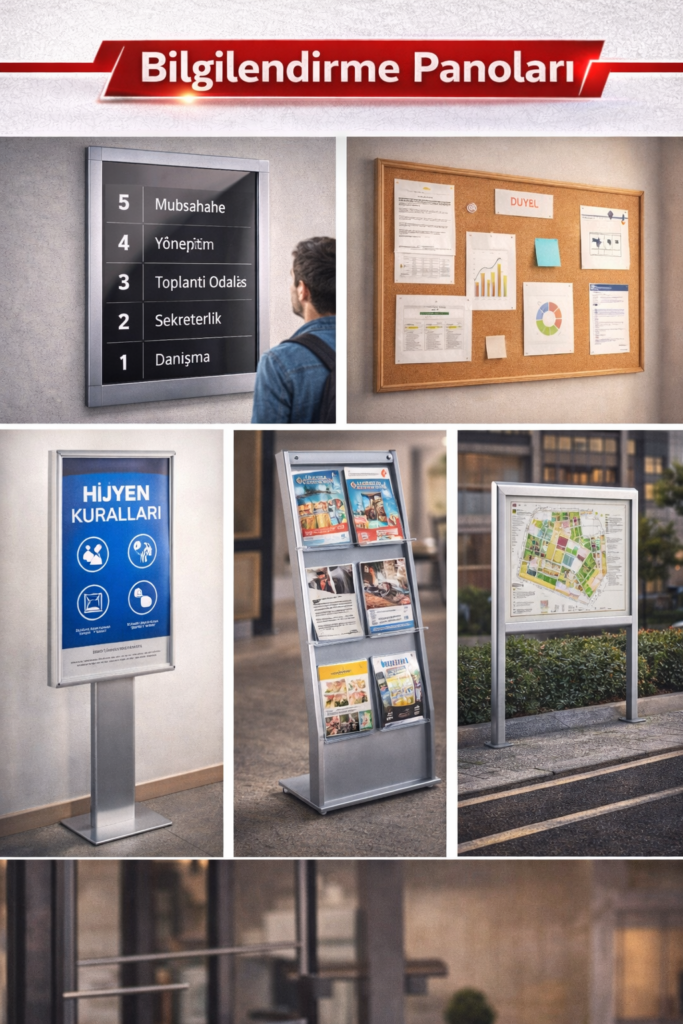 Bilgilendirme panoları, duyuru, ilan ve yönlendirme amaçlı kullanılan pratik ve kurumsal çözümler sunar. Okullar, hastaneler, kamu kurumları, apartmanlar, siteler ve iş merkezlerinde düzeni sağlamak ve bilgileri görünür hale getirmek için tercih edilir. Hem iç mekân hem de dış mekâna uygun modelleri mevcuttur.