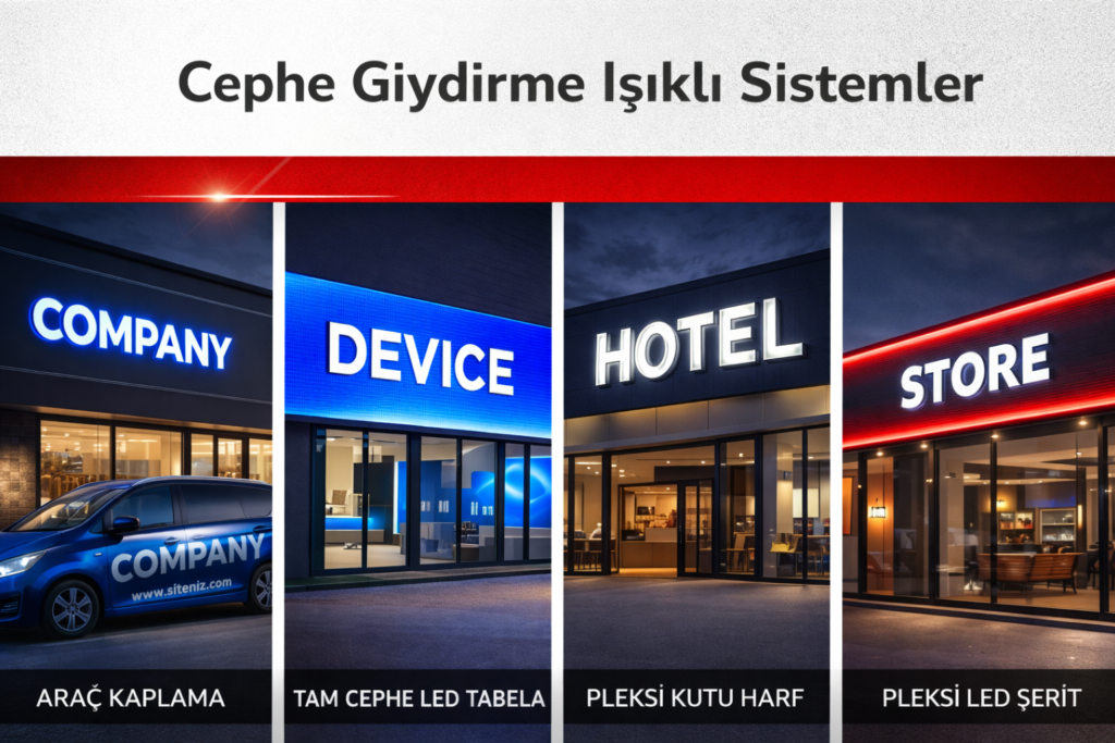 Cephe giydirme ışıklı sistemler, işletmenizin dış cephesini tamamen kaplayarak güçlü ve kurumsal bir görünüm kazandıran reklam uygulamalarıdır. Özellikle büyük mağazalar, zincir markalar, AVM’ler ve kurumsal firmalar için prestijli bir çözümdür. Hem estetik hem de dikkat çekici bir reklam etkisi sağlar.
