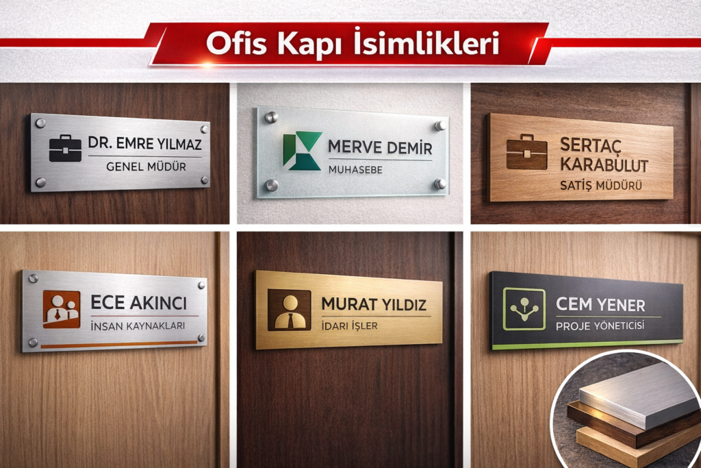 Kapı isimlikleri; pleksi, alüminyum, kompozit, cam veya lazer kesim malzemeler kullanılarak üretilir. Üzerine folyo kesim, UV baskı veya kabartma harf uygulanabilir. Kurum logosu ve departman isimleri isteğe göre tasarlanır.