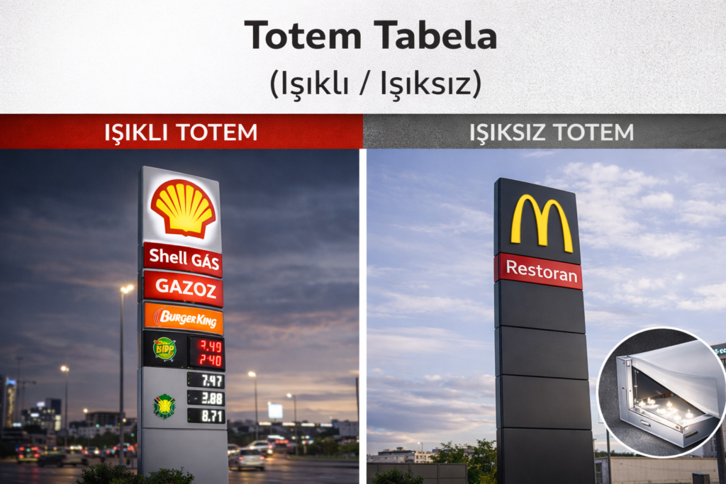 LED aydınlatmalı totem tabelalar gece ve gündüz maksimum görünürlük sağlar. İçten LED sistemle aydınlatılan yüzeyler, özellikle akşam saatlerinde güçlü bir reklam etkisi oluşturur. Akaryakıt istasyonları, AVM’ler, hastaneler, oteller ve büyük işletmeler tarafından sıkça tercih edilir.
