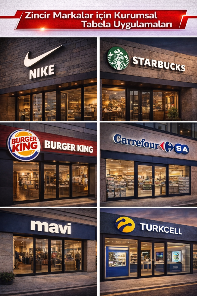Zincir markalar için kurumsal tabela uygulamaları, tüm şubelerde aynı tasarım ve standartların korunmasını sağlayan profesyonel reklam çözümleridir. Marka bütünlüğünü korumak ve güçlü bir kurumsal imaj oluşturmak için tabela, cephe kaplama ve yönlendirme sistemlerinin belirli standartlarda uygulanması büyük önem taşır.